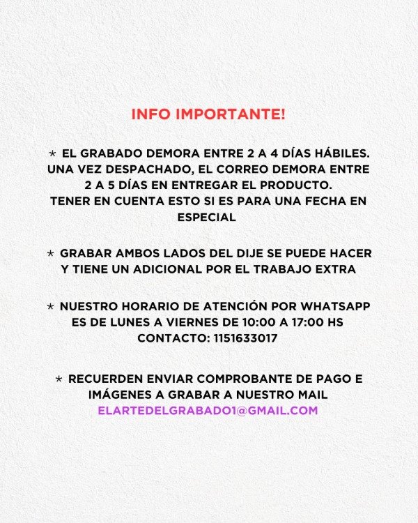Por favor enviar a nuestro mail (elartedelgrabado1@gmail.com) el comprobante de pago junto a las fotos y/o frases a grabar